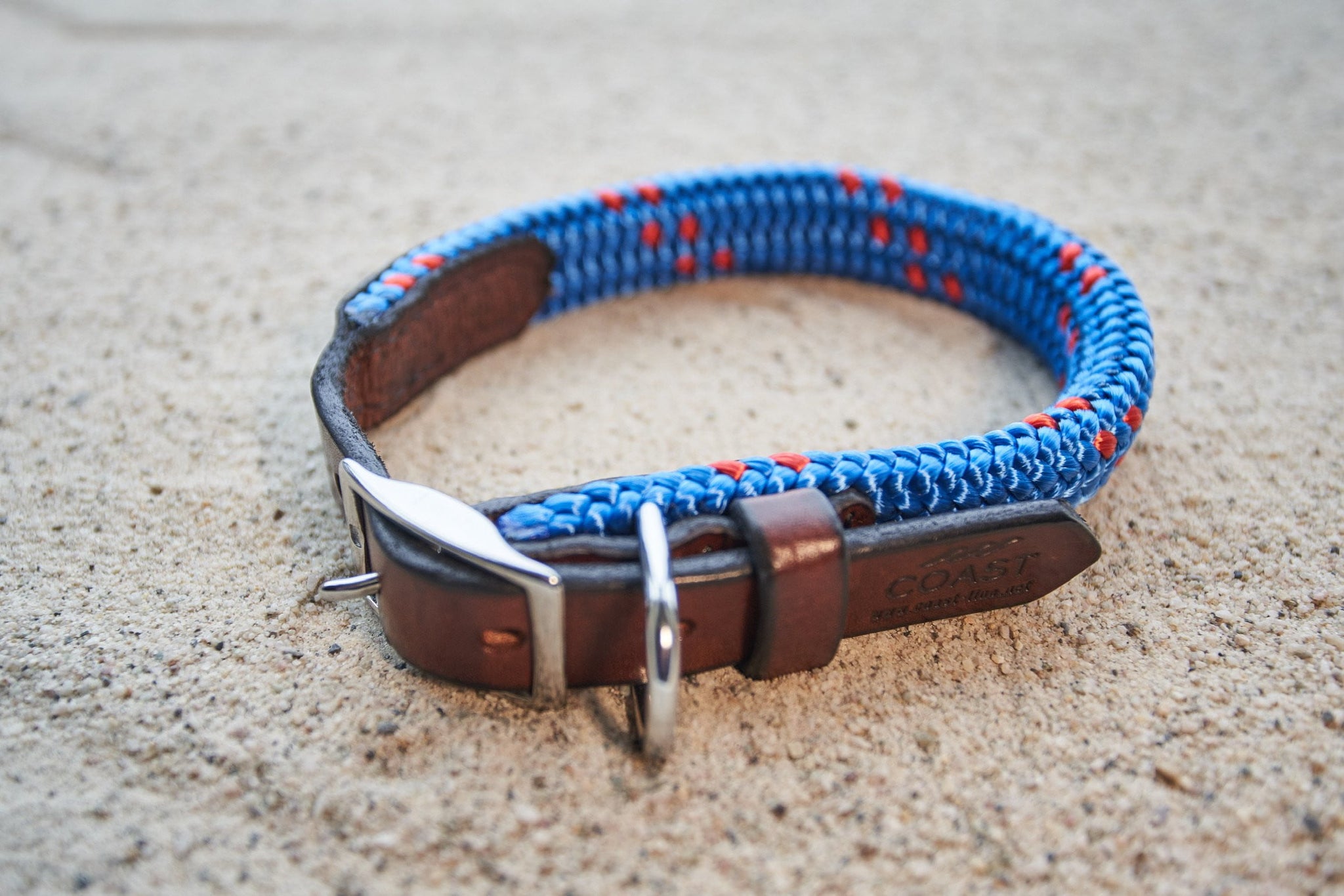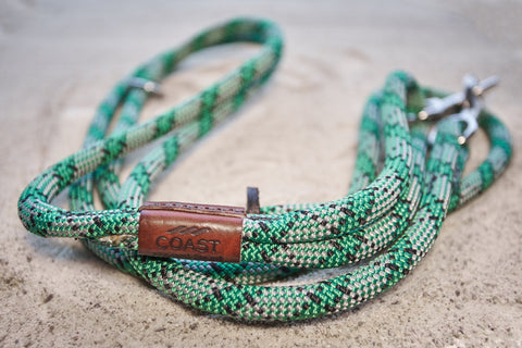 Fun, Lightweight and Versatile. The Original Coast Line Leash can be enjoyed five ways! It's a hands-free sling, a traditional leash, you can walk two dogs at once, run with your pup, and it's a safe way to tether your dog while at the dock or eating at your favorite restaurant. Each line is made with a strong nylon core and soft polyester cover resulting in a line that is high in strength, has great shock absorption, yet has an extremely soft feel. The diameter is designed to fit perfectly, and naturally in your hand, and is versatile enough to be enjoyed by pups of all sizes. The custom saddle leather slider, allows you to adjust the leash from 4’ - 8’, or for comfort when coasting hands-free. Finished with stainless steel hardware. Full length measuring 8’.